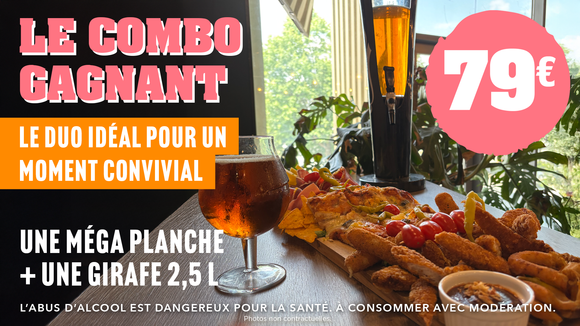 Le Combo Gagnant, c’est une méga-planche charcuterie+fromage de 90 cm et sa girafe 2,5L de bière au choix. A partager entre 6 à 8 personnes.