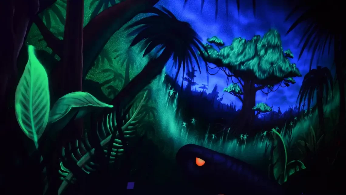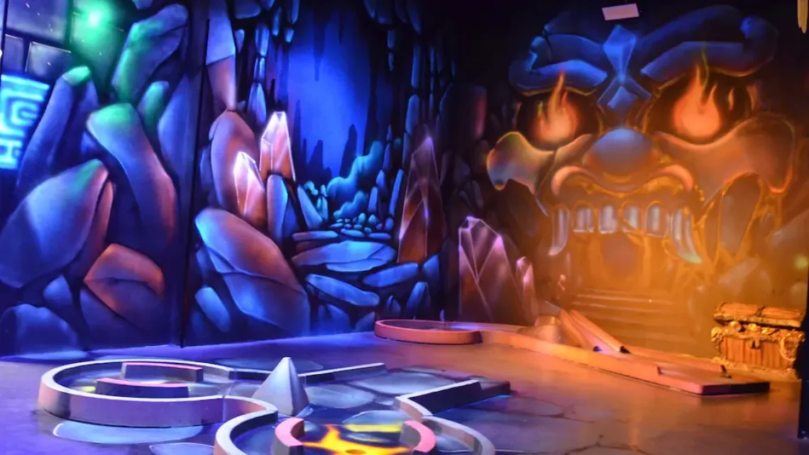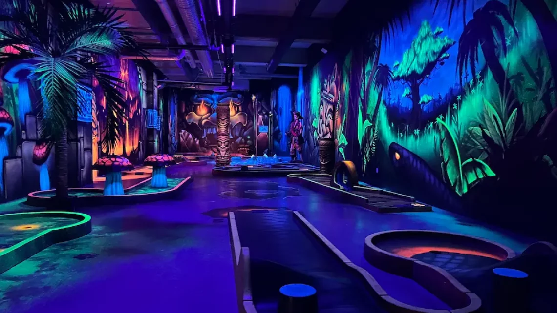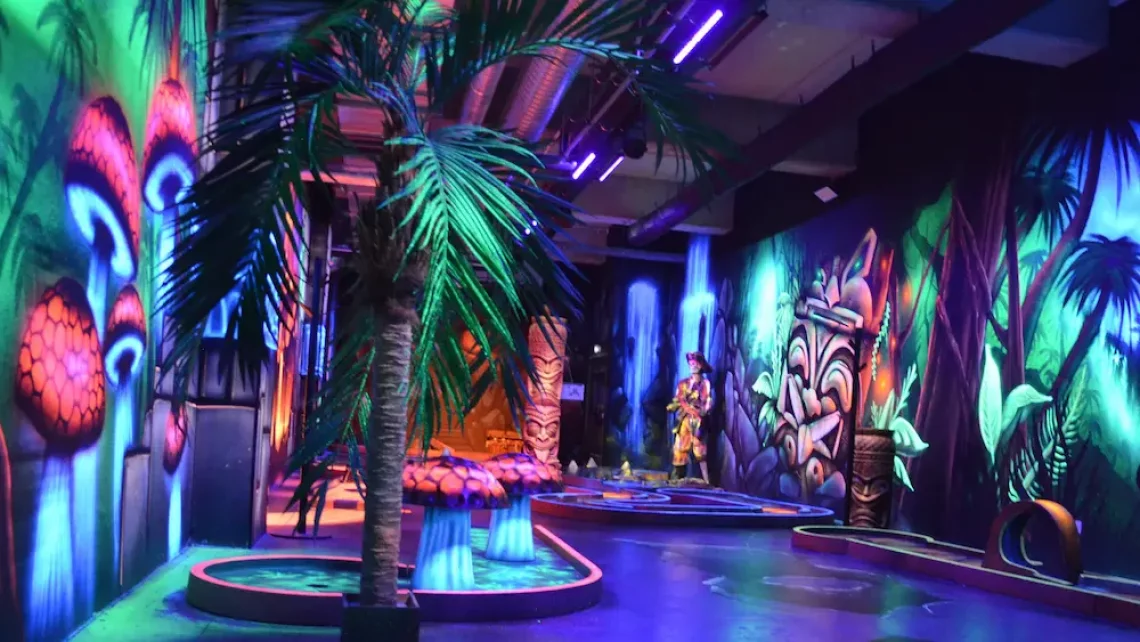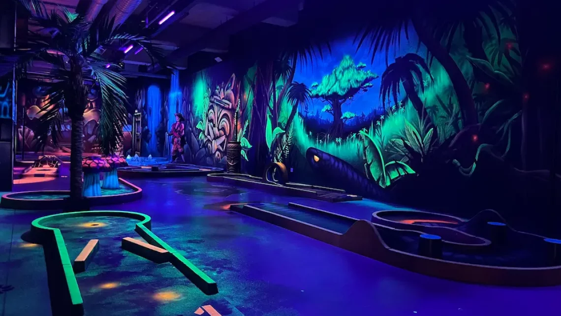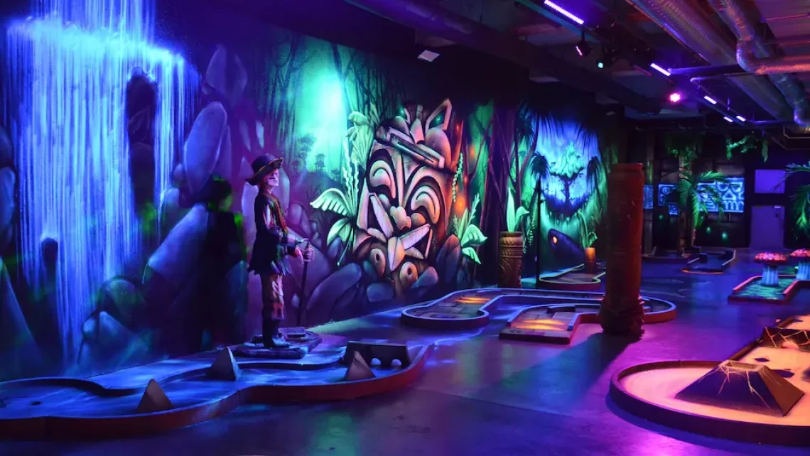 Tous les décors, créatures et personnages de notre mini-golf intérieur ont été peints par des artistes. Les néons de lumière noire font réagir les peintures spéciales et donnent à l’ensemble une atmosphère unique et dépaysante.
